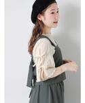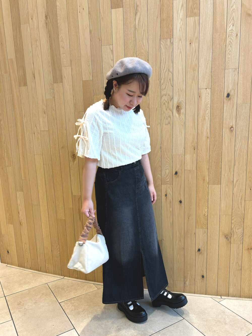 肩のリボンがかわいいカットソーに細見えデニムスカートを合わせました🍁 デニムスカートはウエストがゴムで履きやすいのにストンと落ちた形なのですっきり細見え! コーデュロイのバッグにストラップシューズ、ベレー帽が秋らしさを際立たせてくれます🎃
