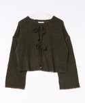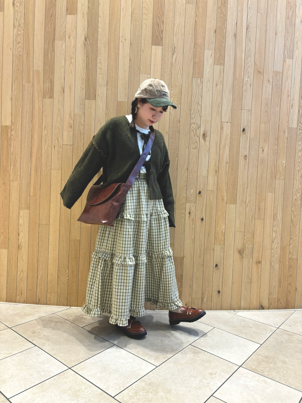 ボリュームたっぷりのティアードスカートに、人気のカーディガンを合わせました💚 ヴィンテージライクなカバンと色を合わせたローファーがポイントです👜 カーディガンのリボンの間からは落書き風のプリントがちらり👀 ハートが少し見えるのがかわいいです! カーディガン無しでもかわいい組み合わせです🤎