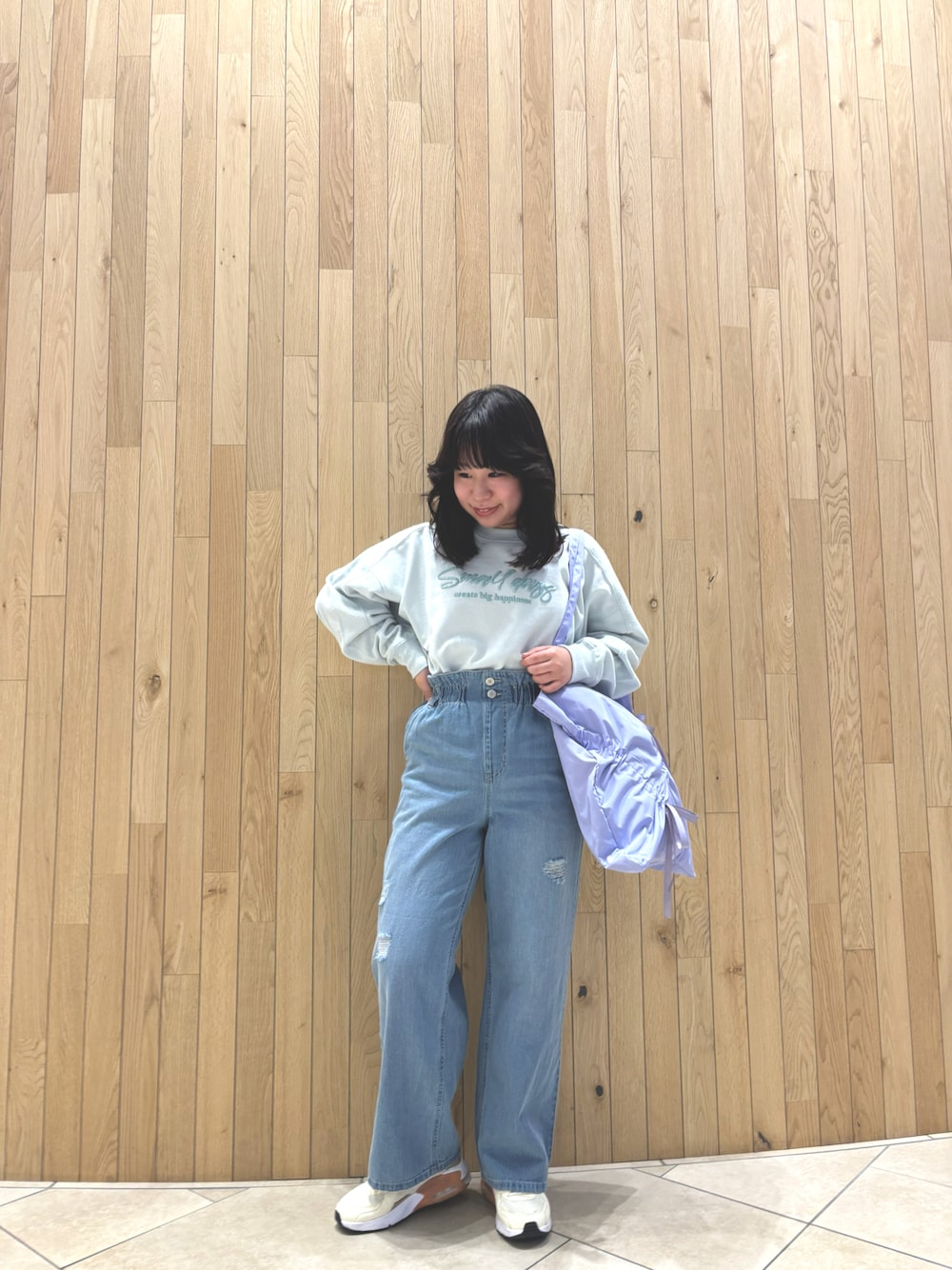 ミントの色が爽やかでかわいいプルオーバーはデニムにインして合わせるとレトロっぽく着こなせます🌟 デニムはウエストがゴムになっているのでとても楽ちんです!厚みのあるプルオーバーもスッキリ収まるのでとても着やすいです✨