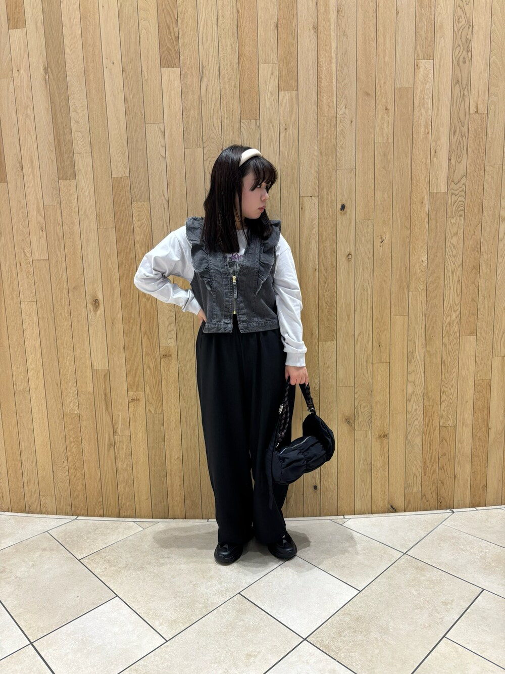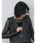 フリルが可愛いデニムベストは、ショート丈なのでハイウエストのパンツと合わせると相性がいいです🙆🏻♀️ フォトロンTと合わせると、ベストの下にフォトプリントが見えてかわいいです🖤