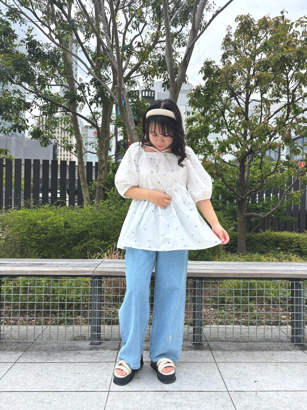 スクエアネックが女性らしいブラウスは、小さなお花が刺繍されているのでガーリーに着ていただけます! とても軽くふわっと着ることが出来るので、暑い日でも快適です☀️ 私が今回着用したオフのお色は透け感があるので、中にキャミソールやタンクトップを着るのをおすすめします🤍 デニムとあわせてカジュアルにコーディネートしました! デニムはシルバーの箔付きなので華やかです✨ワイドデニムなので足が長く見えます! 厚底のサンダルと相性◎です🌟 ゴールデンウィークのお出かけにもピッタリなコーディネートです💫