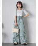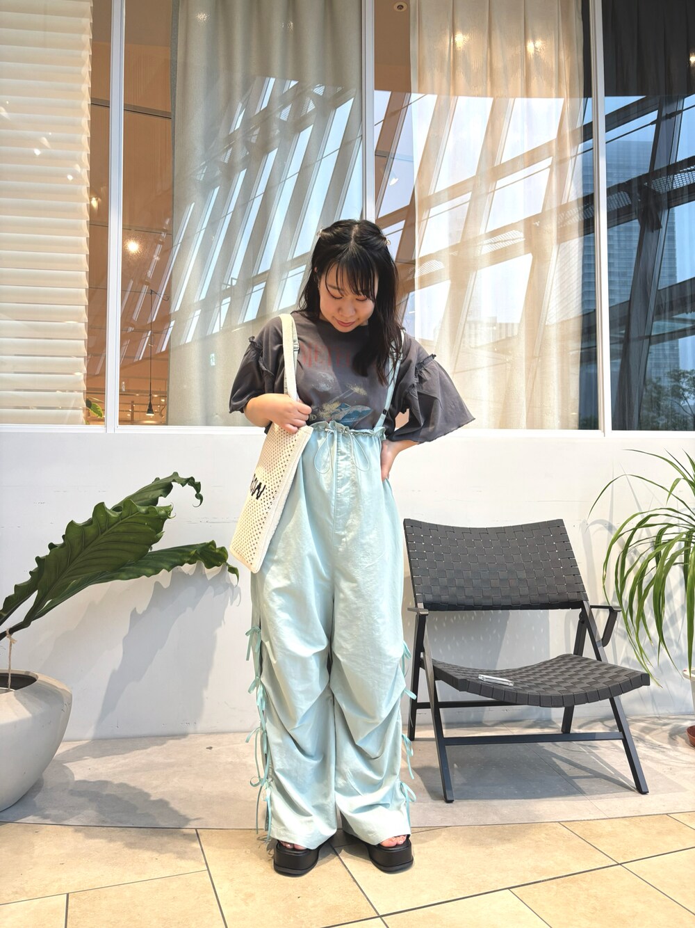 フリルの袖が可愛いTシャツは、サイドにリボンが付いたサロペットと合わせるとカジュアルガーリーになります🎀 Tシャツの色をチャコールにすることで、甘くなりすぎずカジュアルに着ていただけます🌷 サロペットは153cmで厚底のサンダルを履いて床につかない位の長さです! 肩のストラップで調節もできます💫