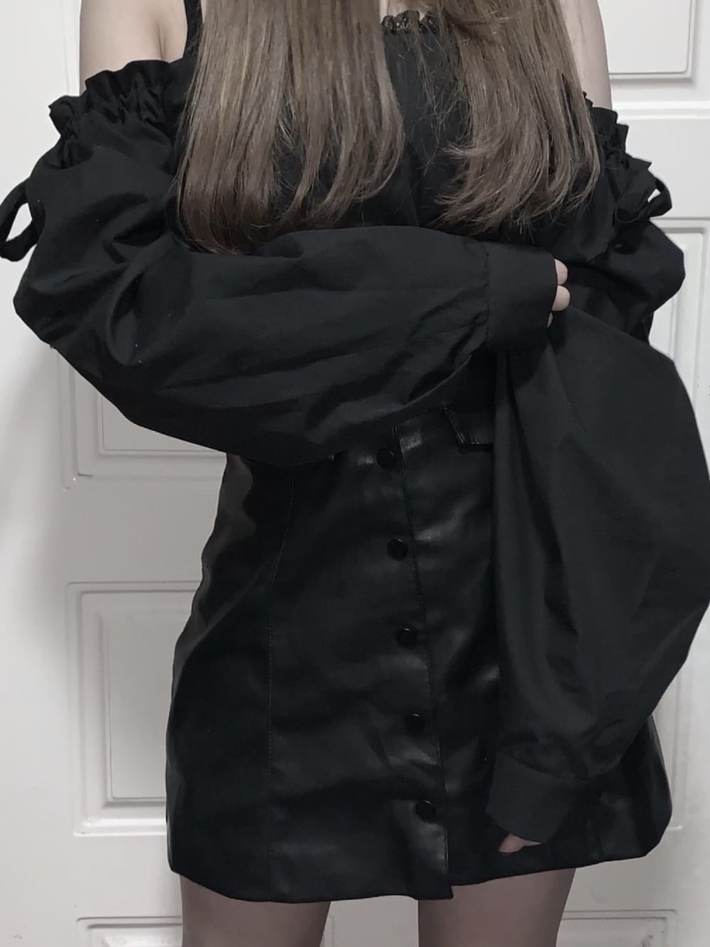 ブラック系のシャツ/ブラウス、ブラック系のスカートを着用したレディースの春コーディネートの1枚目の写真