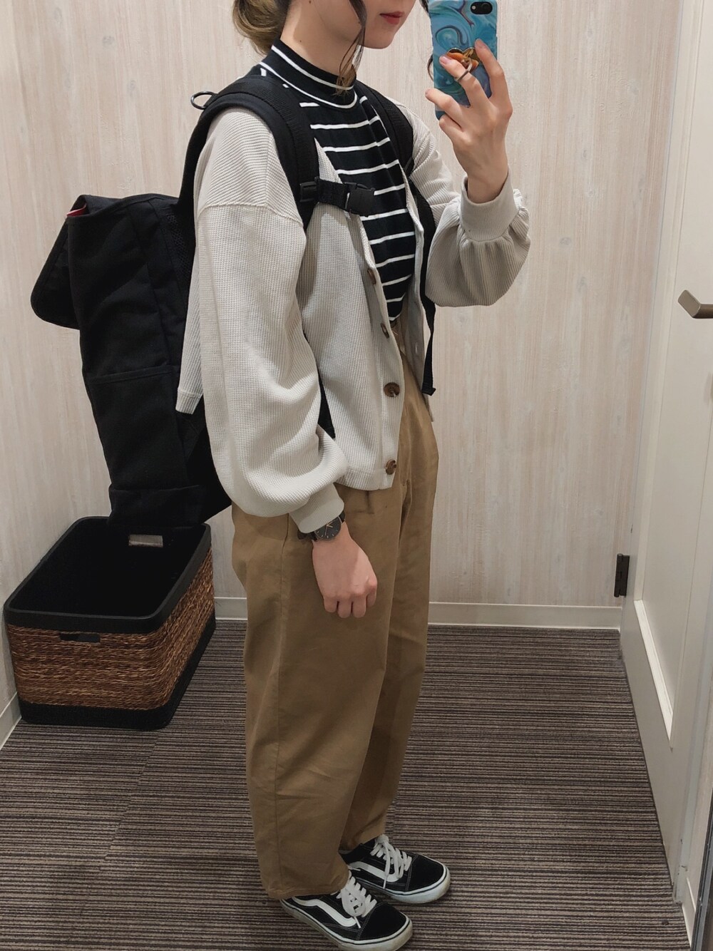 ベージュ系のチノパンツを着用したレディースの秋コーディネートの1枚目の写真