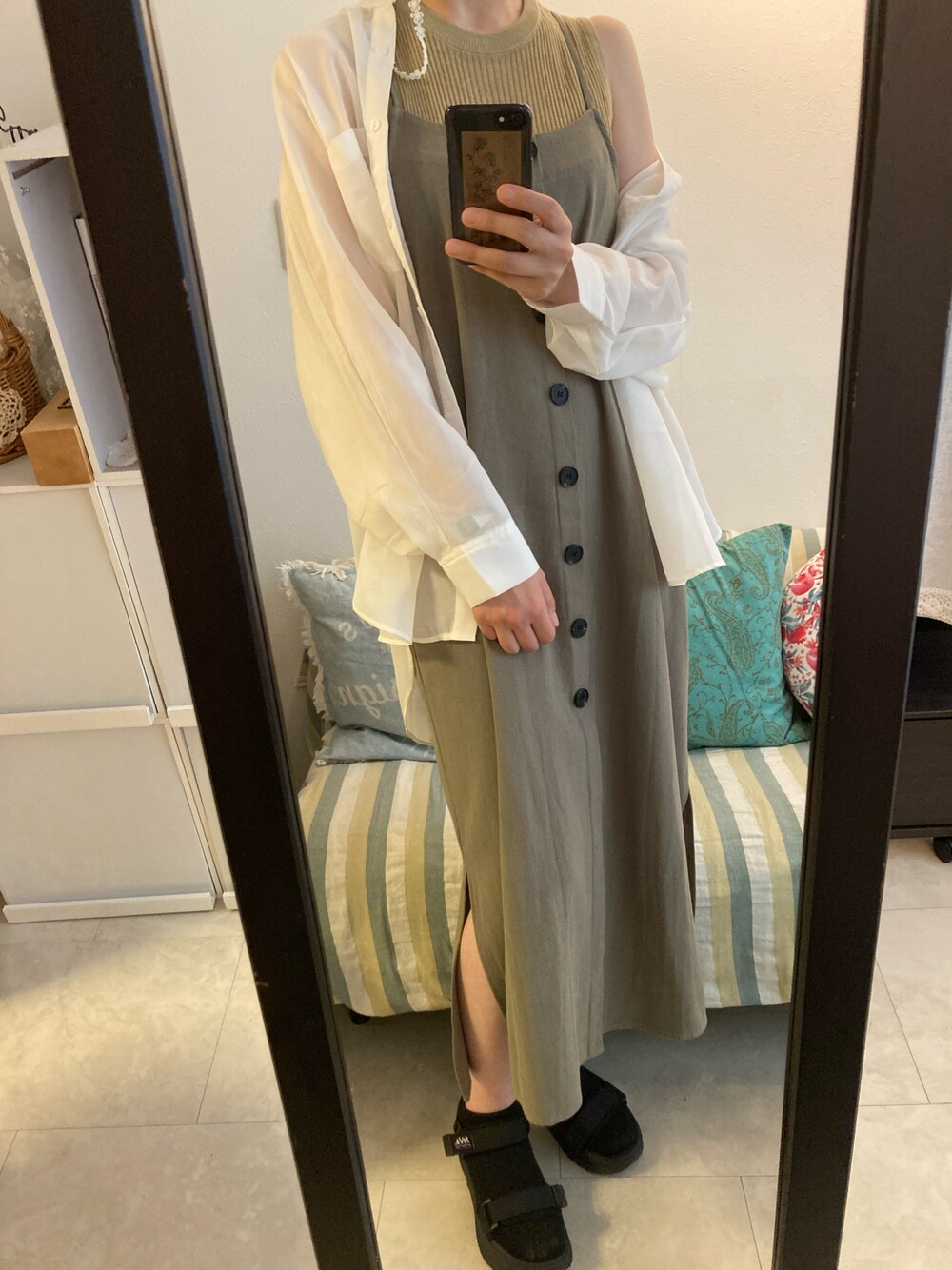 シアーシャツ × キャミワンピの楽ちんコーデ。 色味を秋っぽく。 Crisp yours バックリボンストレートワンピース カーキ FREEサイズ