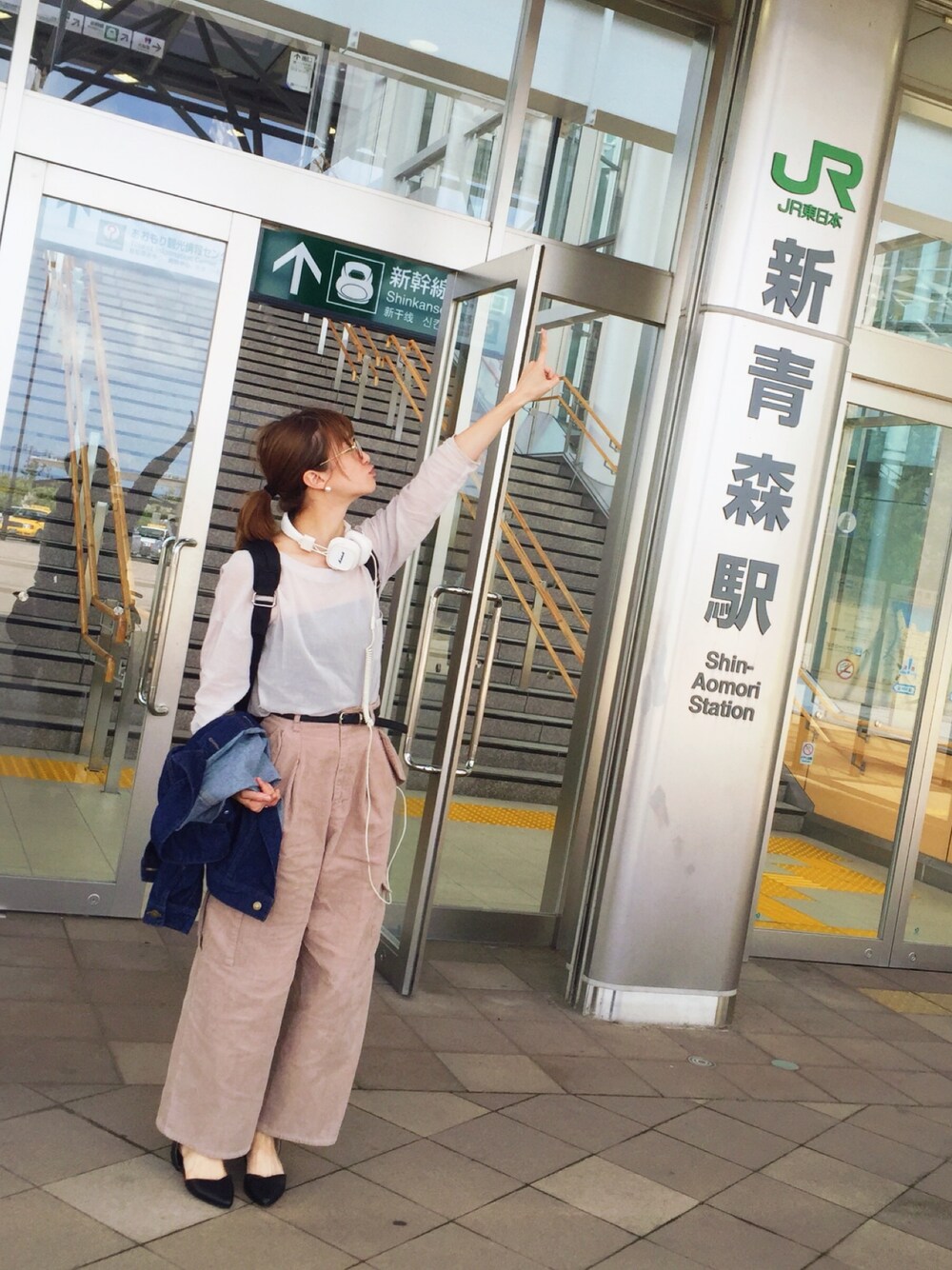 人生初の青森へ🏃 少し肌寒いとの情報を知り ずっと履きたかったスボンを👖💓 朝ですっぴんだったので眼鏡を