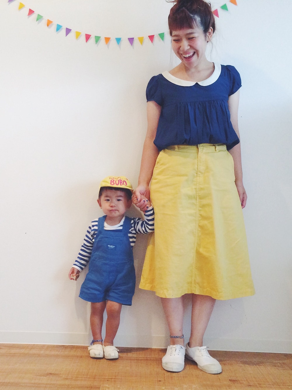 青×黄色の親子コーディネート⚐⚑ セルフタイマーで撮ると頭が切れたり足が切れたりムズカシイ\(^o^)/ オシュコシュのオーバーオールは古着屋さんで500円で購入♡ラッキー♡