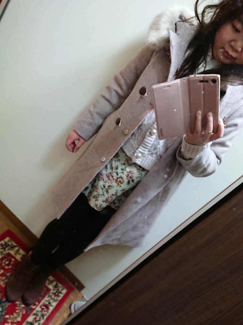 いつかの通勤コーデです。 コート→MAJESTIC LEGON ブラウス→Amavel カーディガン→Ank Rouge スカート→Ank Rouge ブーツ→MAJESTIC LEGON