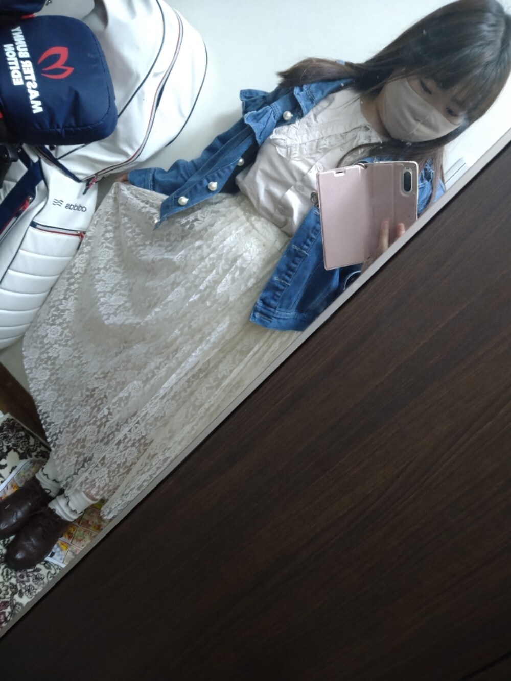 昨日のオフィスコーデです デニムジャケット→Ank Rouge ブラウス→one after another NICE CLAUP スカート→OLIVE des OLIVE 靴下→DAISO 靴→OLIVE des OLIVE(アウトレット