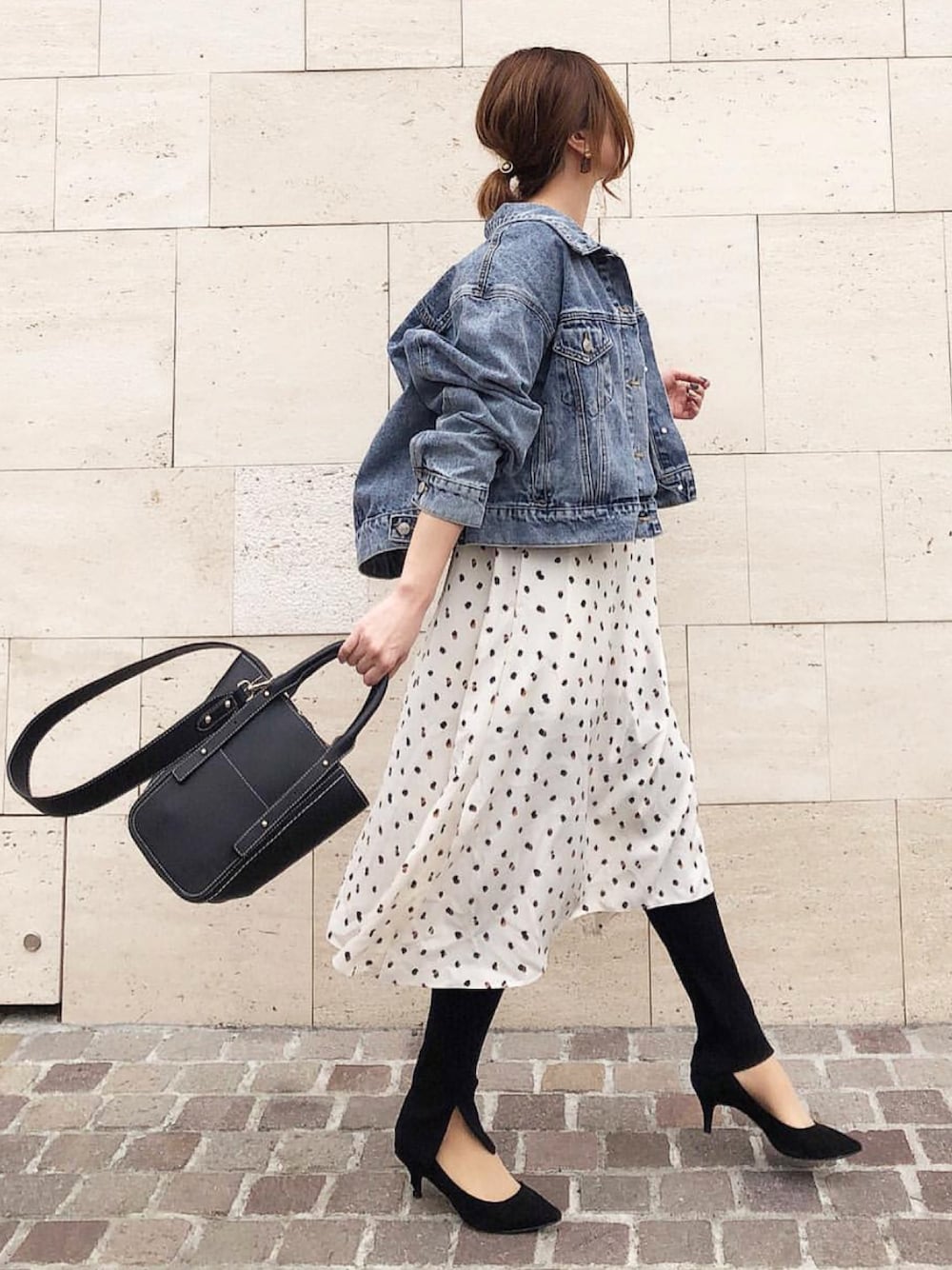 ブルー系のデニムジャケット、ブラック系のパンプスを着用したレディースの春コーディネートの1枚目の写真