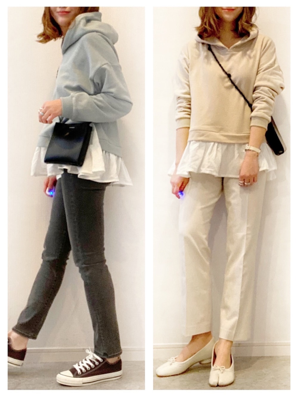 @rococo39 楽天MYU×COCOコラボ第二弾!9日20時発売✨ 今旬なニットとパーカー作りました❤️ ▪︎ ドッキング 裏毛フーディ white / navy / bluegray / beige ▪︎ ローゲージ ドッキングニット saxgray / pink / charcoalgray シャツをレイヤードしたニットとパーカー お家でも公園でもスーパーでも 1枚でコーデが決まる楽ちん時短なお洋服。 シャツの色合わせにもこだわりました! 気になるお尻や腰回りもカバーして 細身のスキニーやレギンス、カラーパンツ合わせと 春先までたっぷり使える可愛い主役級トップスです🌷