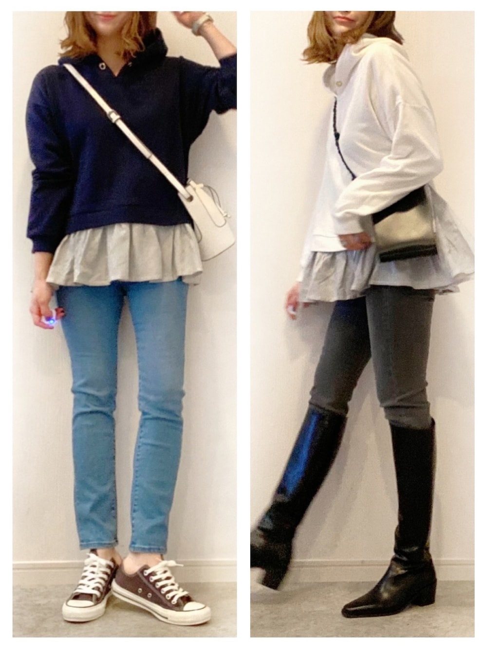 @rococo39 楽天MYU×COCOコラボ第二弾!9日20時発売✨ 今旬なニットとパーカー作りました❤️ ▪︎ ドッキング 裏毛フーディ white / navy / bluegray / beige ▪︎ ローゲージ ドッキングニット saxgray / pink / charcoalgray シャツをレイヤードしたニットとパーカー お家でも公園でもスーパーでも 1枚でコーデが決まる楽ちん時短なお洋服。 シャツの色合わせにもこだわりました! 気になるお尻や腰回りもカバーして 細身のスキニーやレギンス、カラーパンツ合わせと 春先までたっぷり使える可愛い主役級トップスです🌷