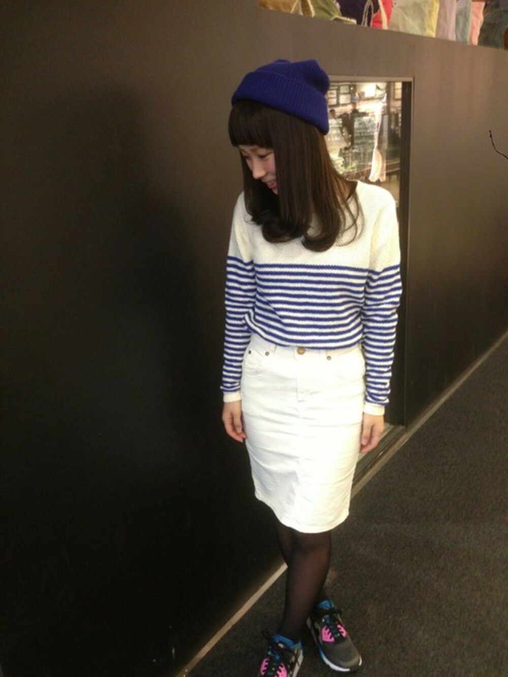 流行りのホワイトペンシルスカートを、スニーカーとニット帽でストリートMIXに*