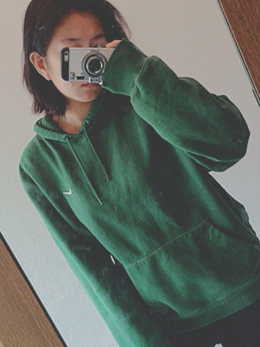 グリーン系のパーカーを着用したレディースの冬コーディネートの1枚目の写真