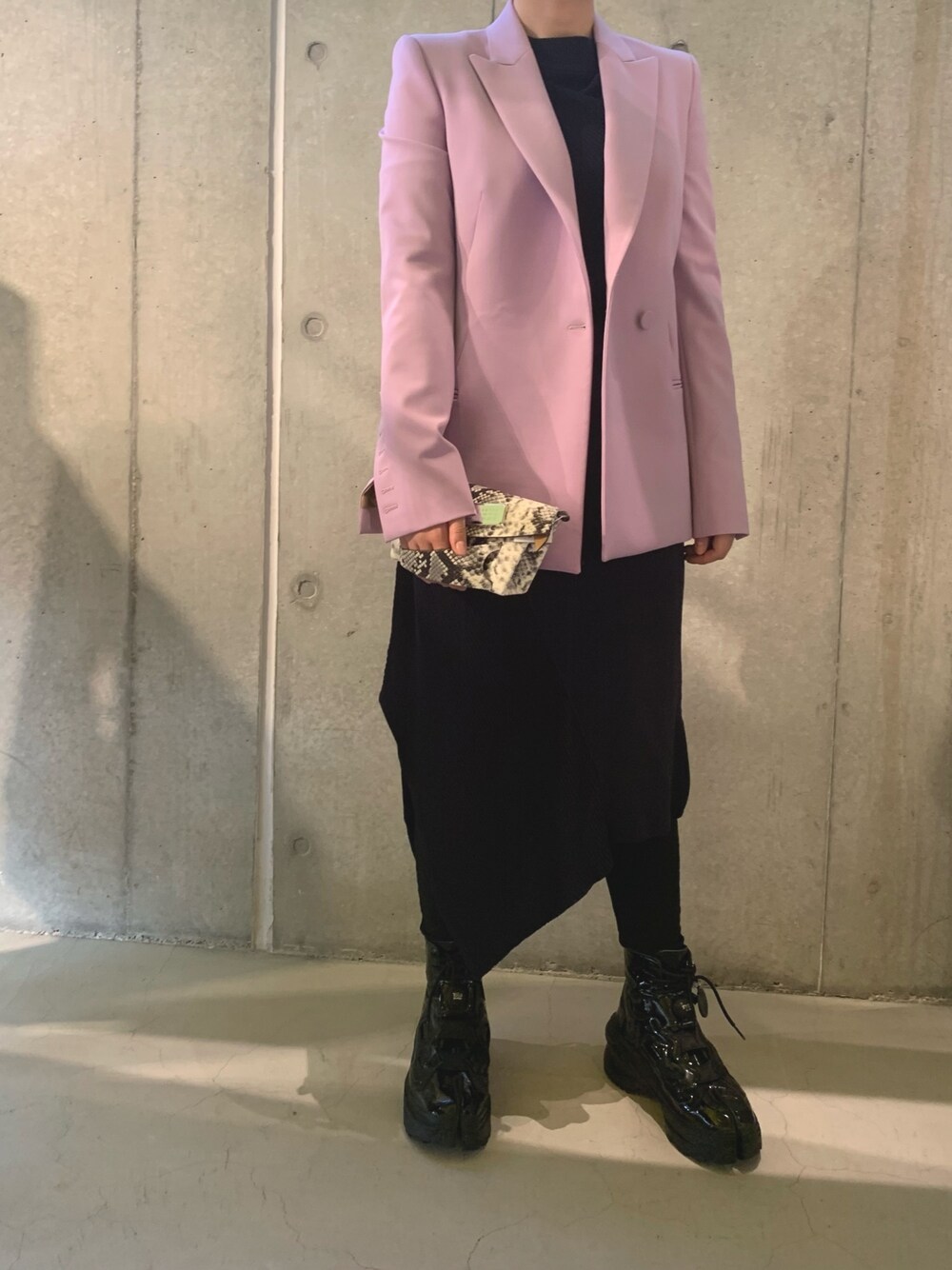 上品なピンクジャケットをあわせて ワンランク上の秋冬コーデに。