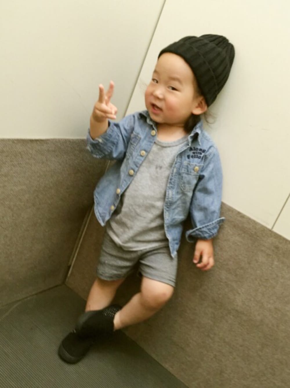 顔とポーズが笑える( ̄▽ ̄) 部屋着で少し外に出た格好ですが… 気がつけば全身西松屋ではないか‼︎ ありがとう西松屋^_^