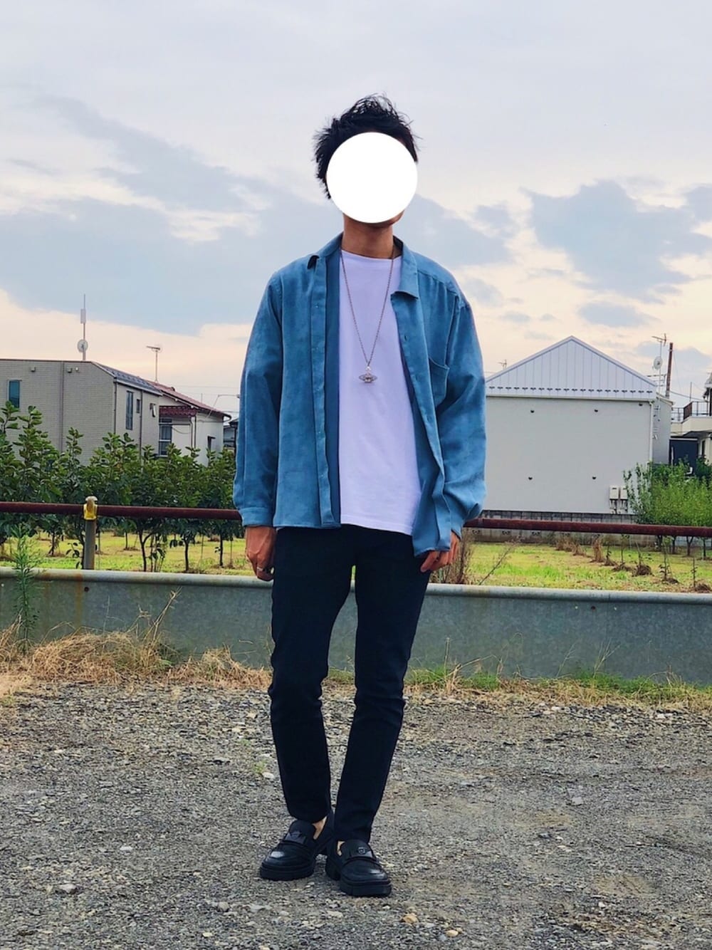 スエード生地のロングシャツで 大人の雰囲気を出せるように意識しました♪ ブルーのシャツとヴィヴィアンのネックレスの相性が抜群でお気に入りのコーデです✨