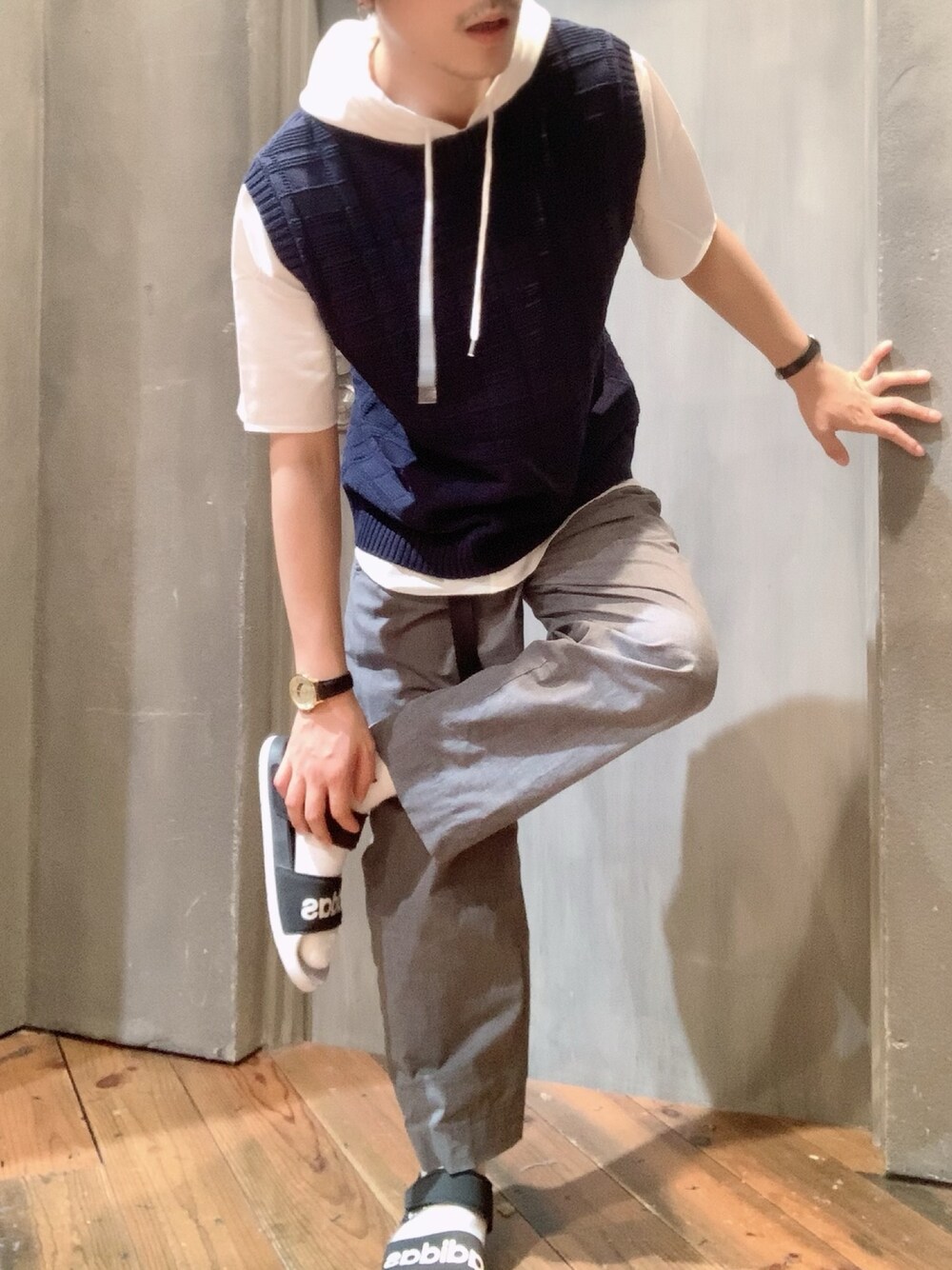 ニットベストにはTシャツばかり合わせてたけど たまにはフード出しちゃってもアリ 楽にオシャレできちゃいます⭐︎