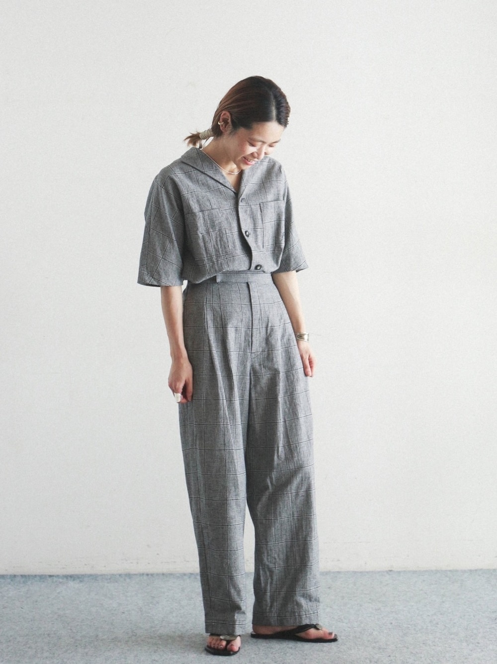 セットアップ。 グレンチェックで秋も使えるかっちり感。 オールインワンみたいだけど トイレも楽ちん◎ 厚みがあるのも嬉しいポイントです。