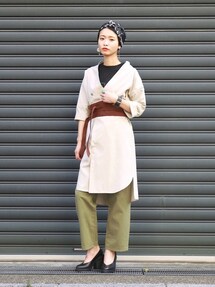TシャツとカーキのパンツにワンピースをON。 バランスをちょっと変えるだけで新鮮です。 本日は着崩して、サッシュベルトと。 羽織としても使いたいアクセントアイテムです。