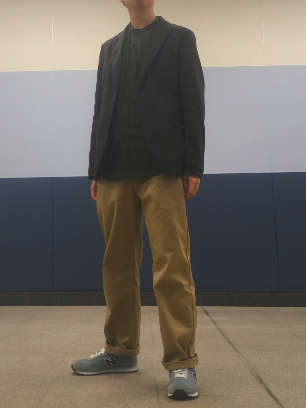 今日の通勤。 グリーンのスタンドカラーシャツ×ダークブラウンのジャケット。 ちょっと色味的に重たかったのでベージュのゆるめのパンツを合わせてバランスを。 UNIQLOのスタンドカラー、とても好き。