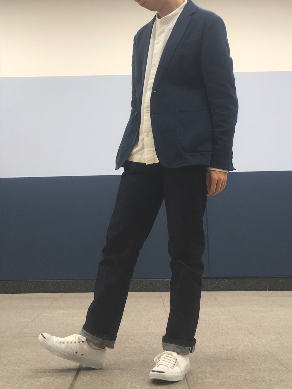青系のジーンズ&ジャケットと、白系のシャツ&スニーカーのシンプルコーデ。 リジッドジーンズの落ち着いた青が職場でも丁度良さげです。