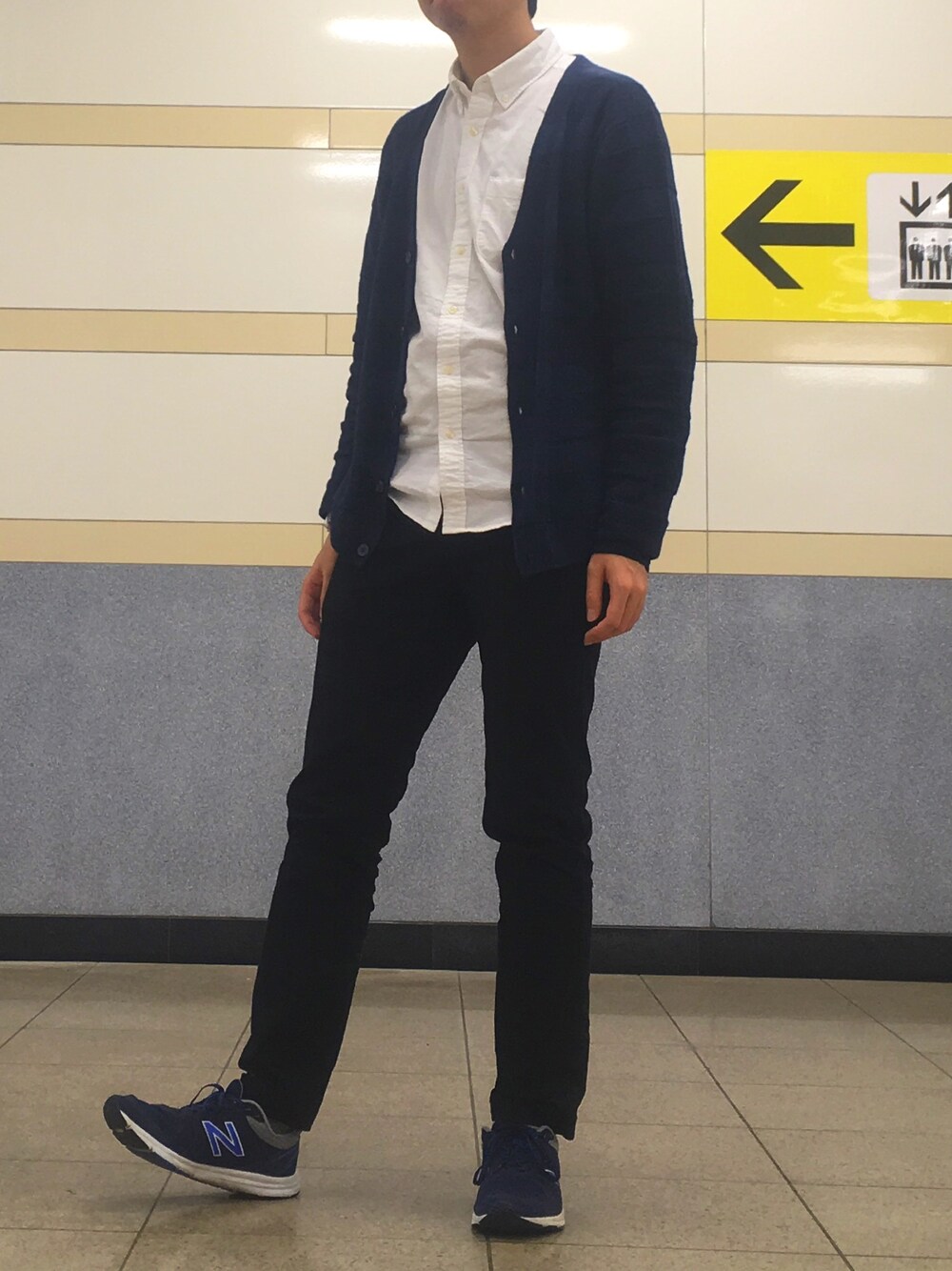 白シャツ×黒スキニーのきれいめコーデに、ランニングシューズを合わせて程よいバランスを目指しました。 青スニーカーとカーディガンを合わせて統一感を演出。 ただ、朝晩の冷え込みはこれだとちょっときつい…笑