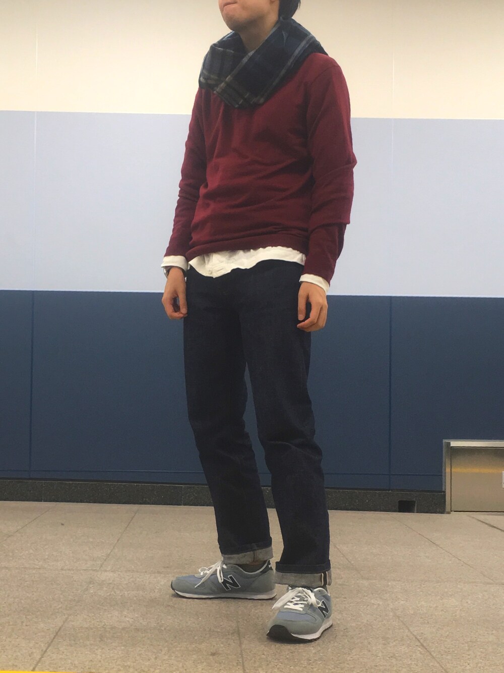赤セーターと青デニムの組み合わせ。白シャツが間に挟まって程よい感じ。