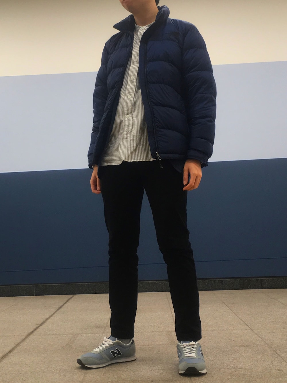バンドカラーシャツとダウンジャケットのほわほわ感がかわいくて気に入ってます。 インナーダウンとして買ったノースフェイスのダウンですが、主力のアウターとして活躍してくれてます。