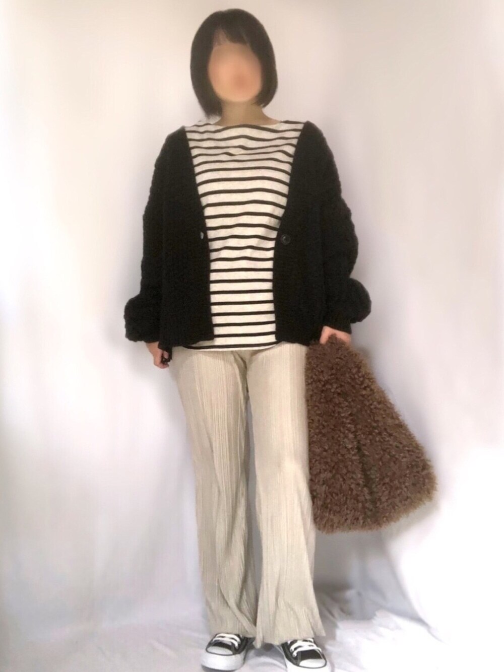 いつもありがとうございます🌟 シンプル上下にモコモコカーデとバック✨なコーデ(≧∀≦)