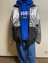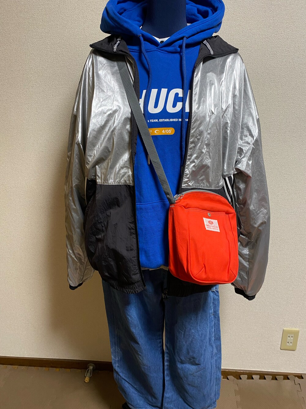 ブルーのパーカーにシルバーのアウターを合わせてかっこよく✨ 赤のミニバッグでやんちゃな感じを足しました🌟