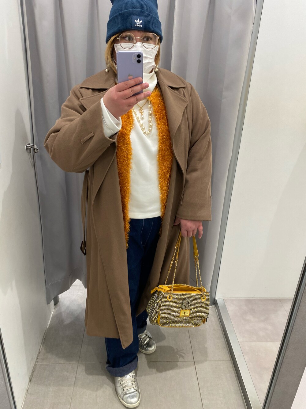 オレンジのラメニットカーデ+黄色のラメツィード風バッグ+ブルーデニムカラーなニット帽に丸眼鏡を合わせたミニオン風コーデ✨ このド派手カーデで行った先はなんと、大人気ラーメン店🍜🤣🌟 本試験に受かれば、4月から働くことになるので、そうなると昼営業のみのこのお店にはあまり行けなくなるため今のうちに堪能しておきました😋💫 食後は、注文してた仕事服を受け取りついでに他にもジャケットを試着してきました🧥🌟