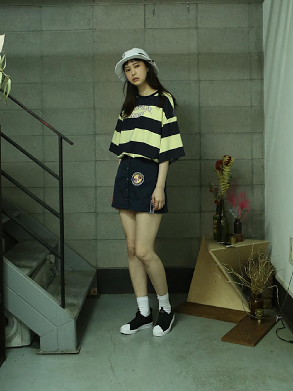 romanticcrownのその他「Tropical Night Stripe T shirt_Navy」を使ったコーディネート