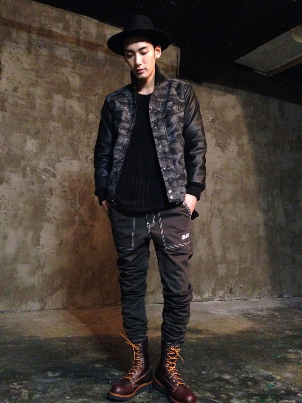 ROMANTIC CROWN HERRINGBONE CAMO STADIUM JACKET MODEL 김용하