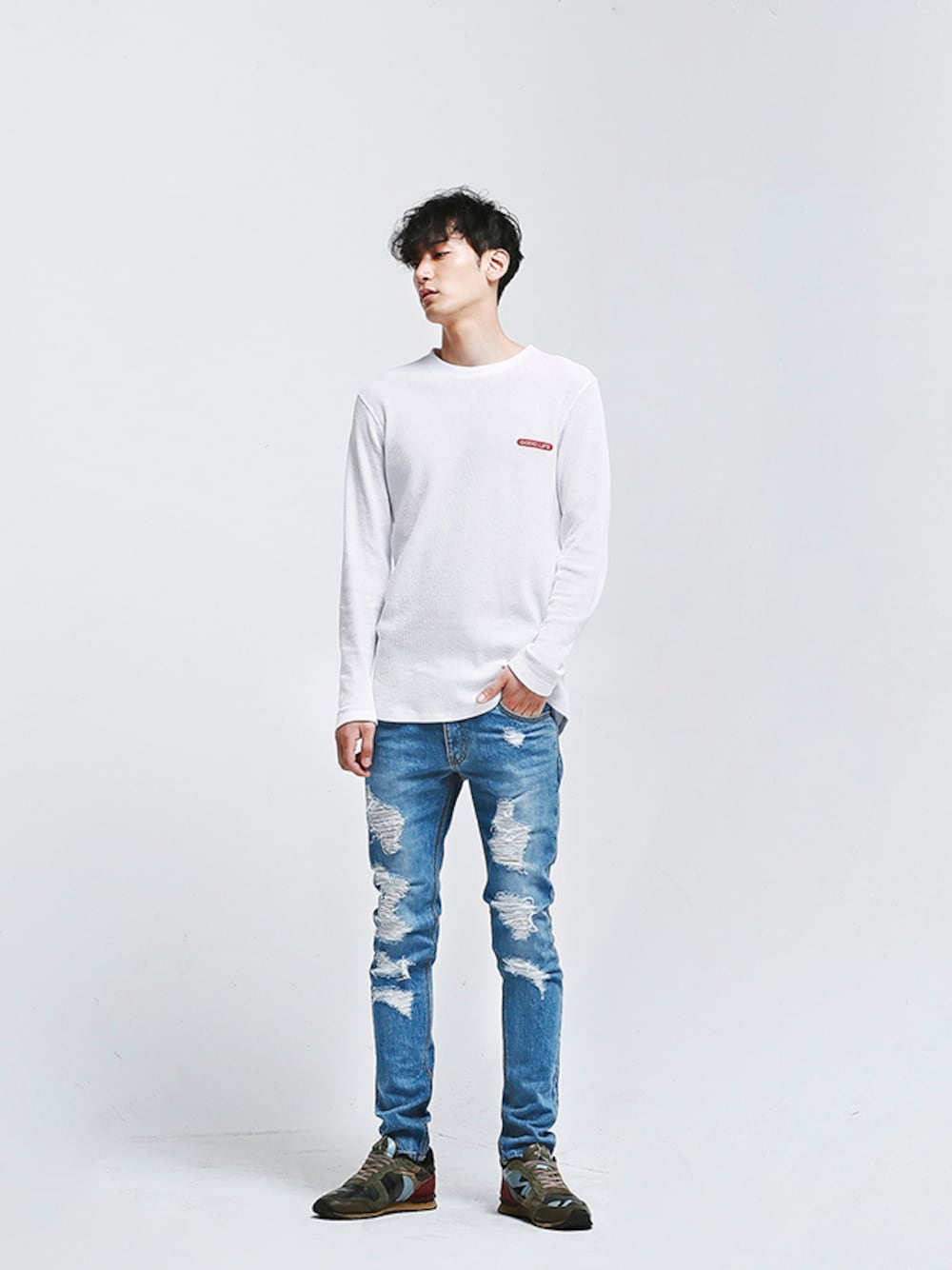 SUNDAY DESTROYED JEANS_SKYBLUE GOOD LIFE WAFFLE CREWNECK WHT ROMANTIC CROWN MODEL 김용하