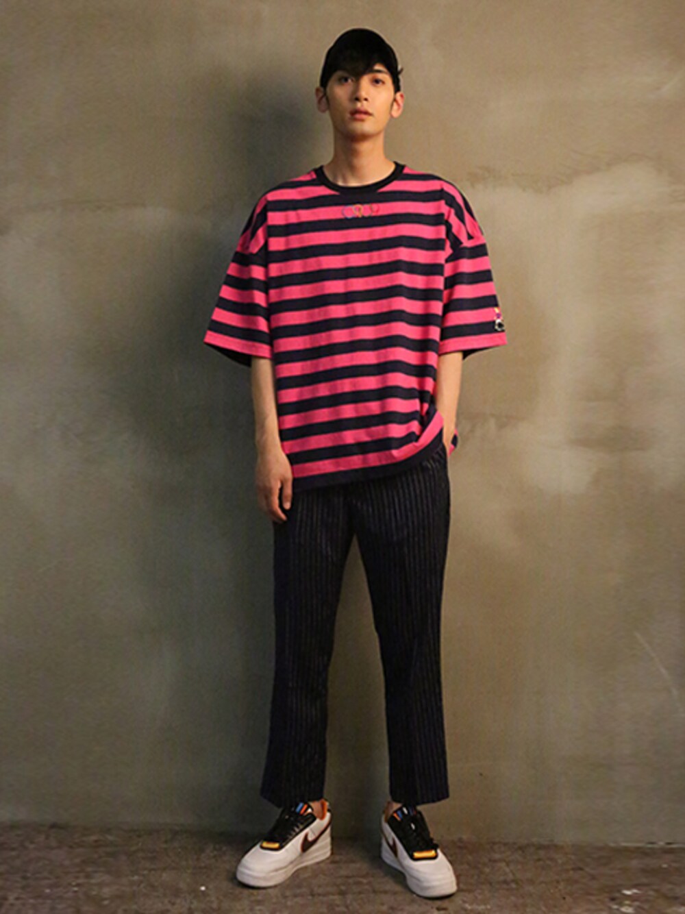 romanticcrownのその他「STRIPE WIDE 1/2 SHIRT_PINK」を使ったコーディネート