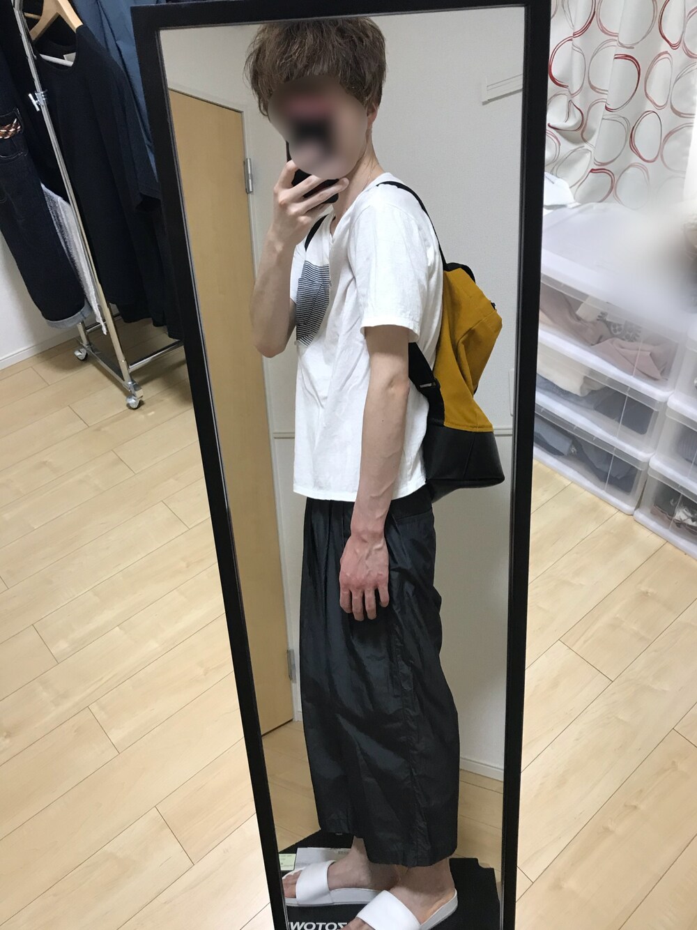 初めての投稿です😅自撮りなので鏡通り越して汚部屋が、、(笑)見られて困るモノはぼかしました(笑) 今日は今年初の30℃越えだし、涼しげ&楽チンな格好で😄 doubletのカットソーはポケットのみならず、もうふた回りくらい広い範囲に別布で切替があってインナーとしても優秀な働きをしてくれるんで、だいぶ長い付き合いです🤝でもそろそろアップデートしたいな白T、、、