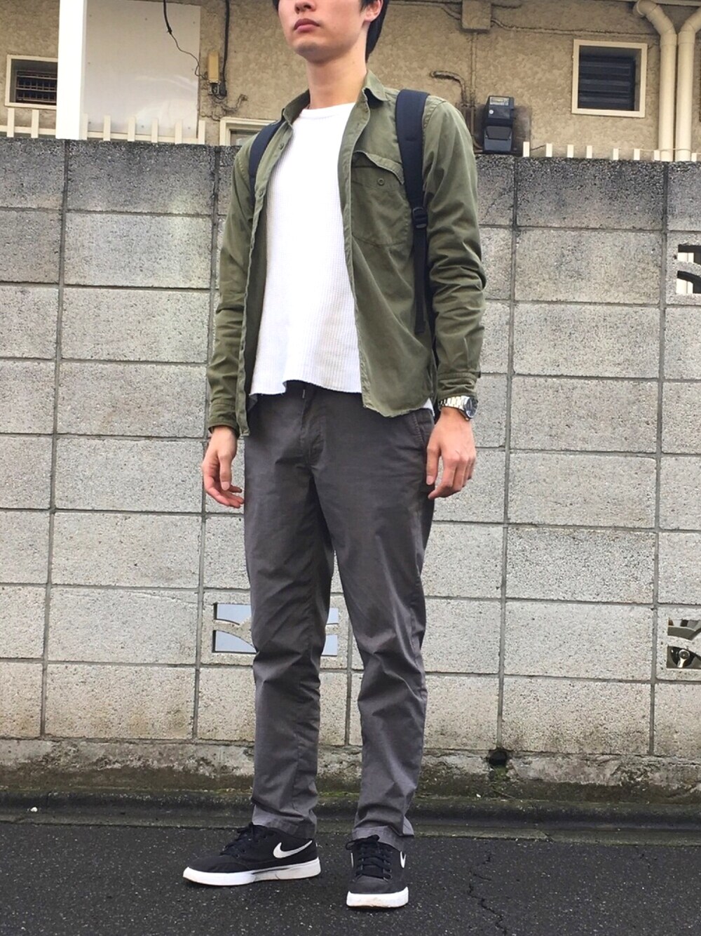 カーキのシャツに、グレーのスラックスを合わせたシンプルなコーディネートです。