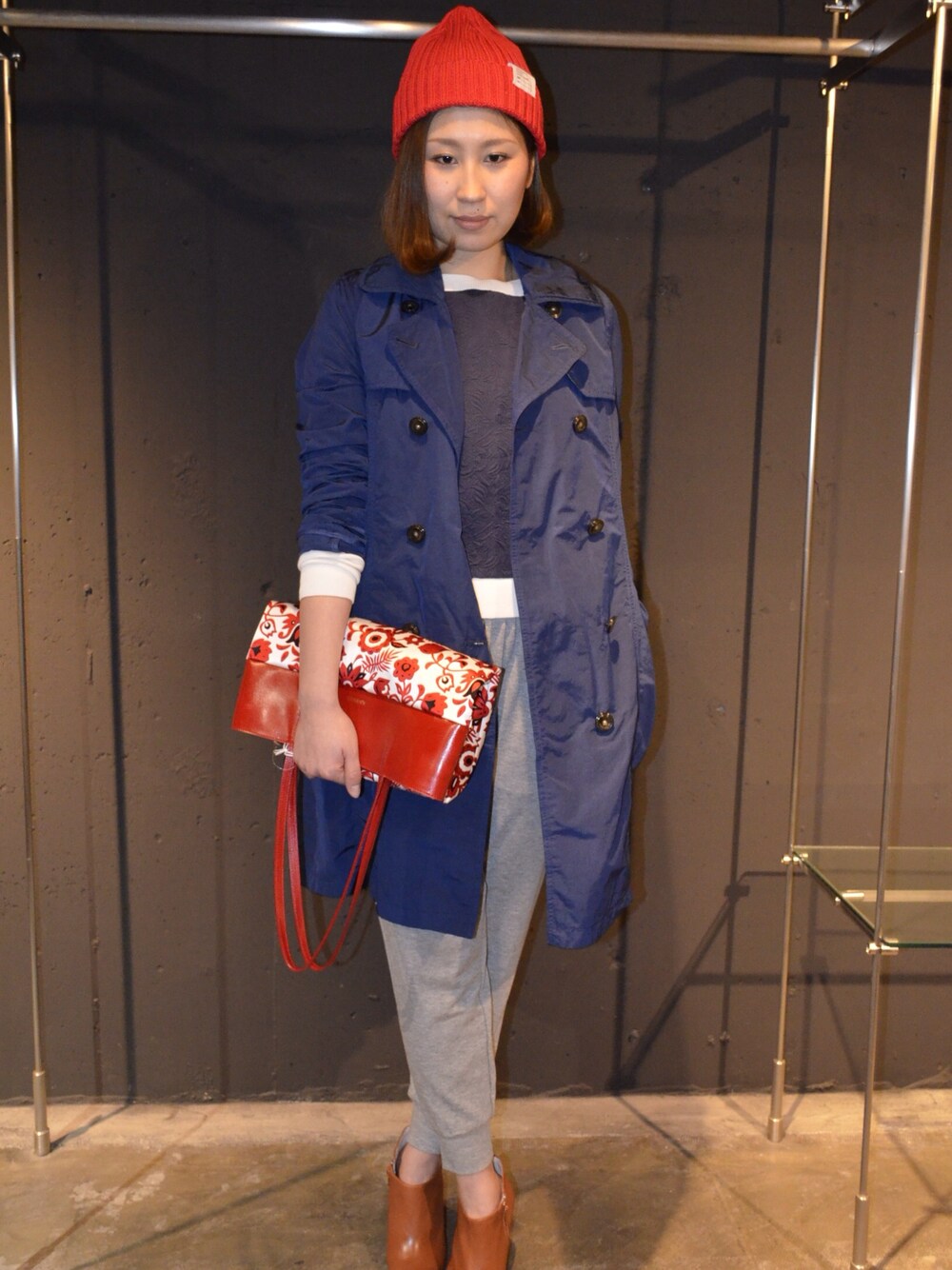 トレンチコートをかっちりとではなくあえてスエットパンツでゆるくあわせ、マリンテイストなカラーリングで冬スタイルに差をつけて。