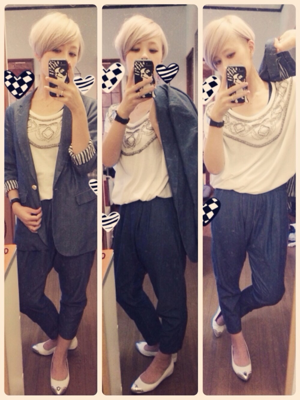 サルエルP…JEANASiS トップス…??? 出かけて気づく… ちょいドラえもんカラーなことに。 今日も肌寒かったので ジャケットひっぱりだし 美容院に行ってまいりました♪ 髪のびてボブショートっぽくなってきたな、 うん。 前さがりーの… 後頭部ほぼ半分刈り上げられーの… 大人めワカメちゃんな仕上がりw 黒髪はまだ悩みちゅー。