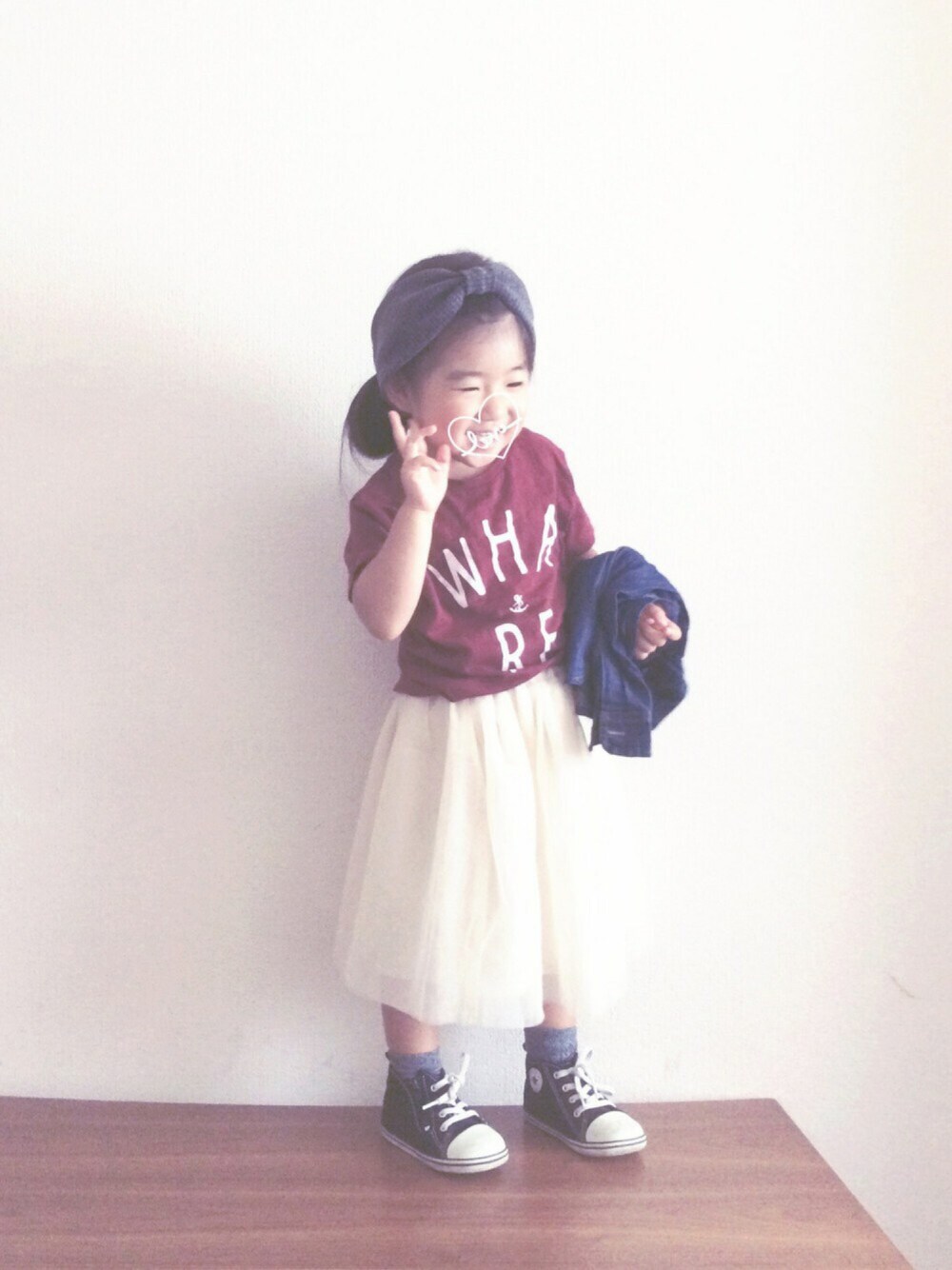 ✌︎♥︎♥︎♥︎ ピース風になっちゃった 笑 久しぶりの白チュール♩ 大喜びの娘… これから毎日履くって言うかしら⍤⃝⁉︎ まだまだ夏コーデで半袖ですが💦見てくれてありがとうございます(❁´◡`❁) せめてと思ってデニムシャツを持ってもらったら 上手に持てた〜♩笑