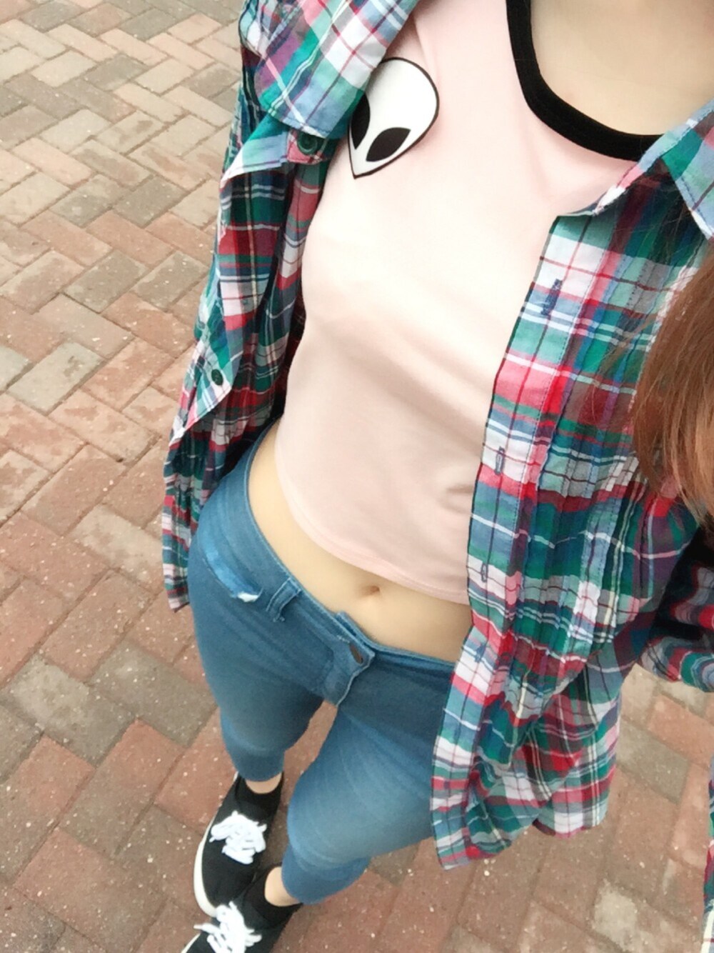 おニューのTシャツ😊💜 黒のワンピと一緒にネットで買ったんだけど、とっても安かった!安かったから、宇宙人さん剥がれかけてるっていうね。まあいいだろう。なんとかします😞 日焼けしたくないから古着のぶっかぶかチェックシャツ羽織ってます! お尻太もも周り太ったから上から撮って詐欺る😄😄 ご飯食べたあとでお腹出てるから凹ませて詐欺る😄😄 いつもコメントいいねsaveフォローありがとうございます、今回もよろしくお願いします💜