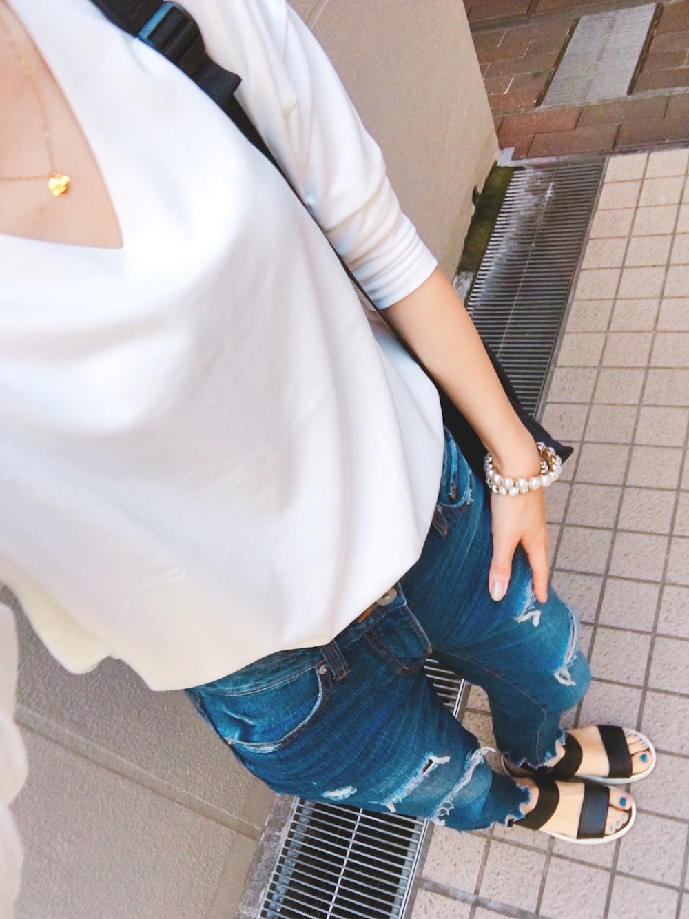 バイト初日! このデニム無くなりそう、、やめて売れないで…😭😭 白とデニム、っていうなんもないけどシンプルにしてみました。足元はまだ夏ね。