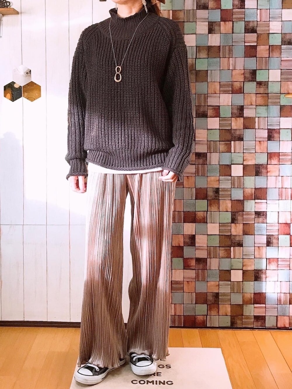 モックネックプルオーバー×ベロアプリーツパンツ