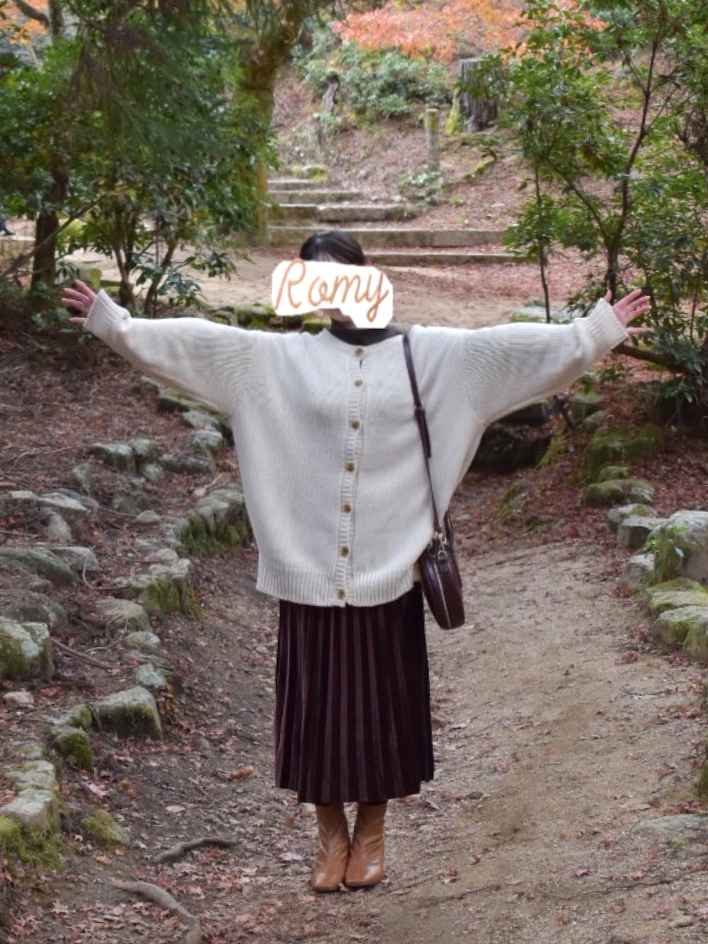 随分前の(笑)秋の紅葉コーデ。 白いカーディガンが秋の色に映えてとても可愛い☺️🍁 インナートップスとスカートの色は統一し、 キャメルのブーツを差し色にしてみました😚