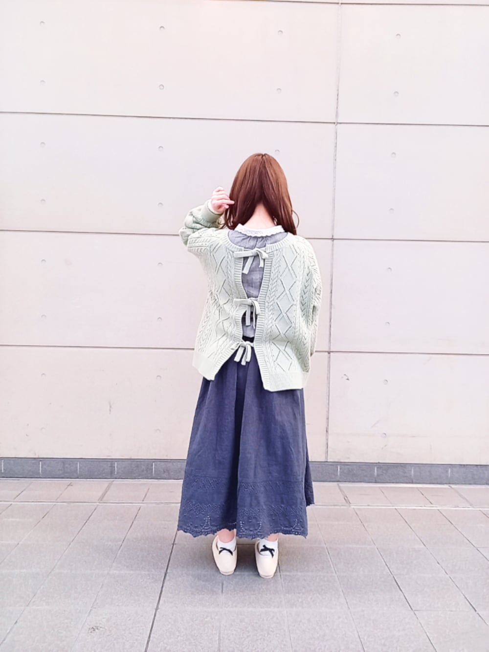 着用しているニットは前後ろどちらでも着られます♪