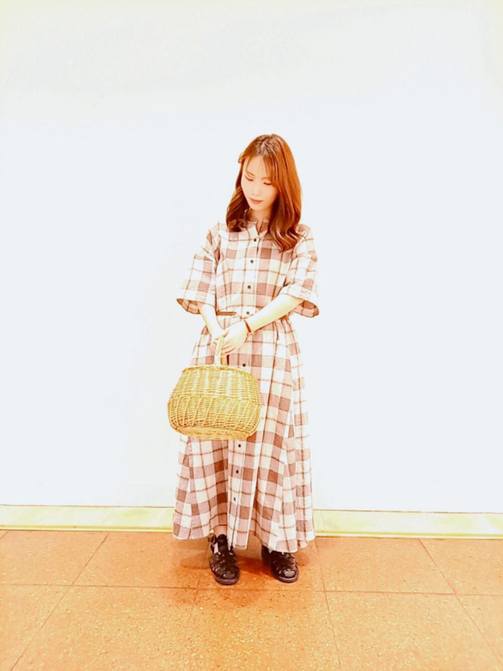 ビッグチェックのワンピースコーデです🌻 低身長さんはウエストマークにしたり、 足元をサンダルにして軽さを出すとカッコいいです✨