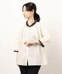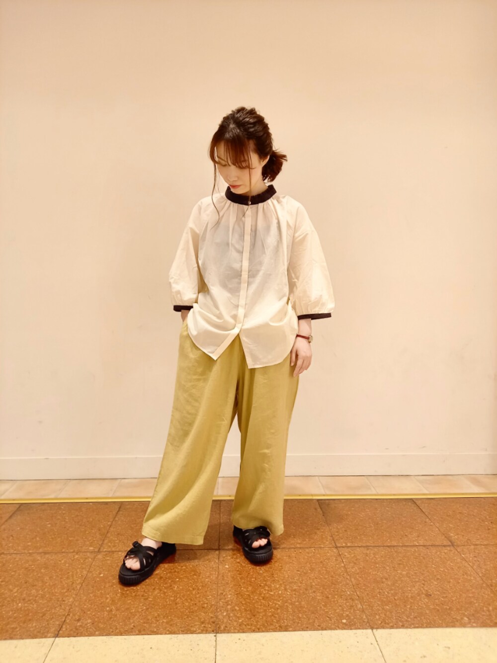 夏らしい透け感のあるブラウスとイエローのパンツコーデです🌻 配色になっている首もと袖もとが可愛いブラウスです♡