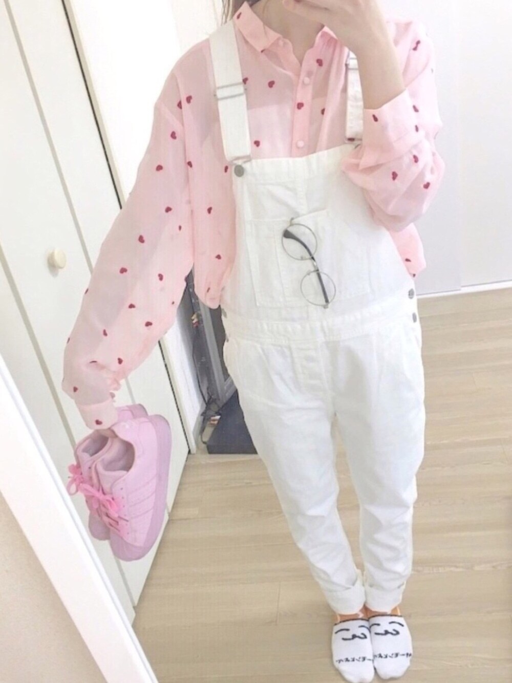 久しぶりに投稿します 白のオーバーオールなので 結構なんでも似合うため ちょっと派手のピンク色のシャツを着てみました( ˊᵕˋ ) ハート柄のシャツでとっても可愛くてお気に入りです
