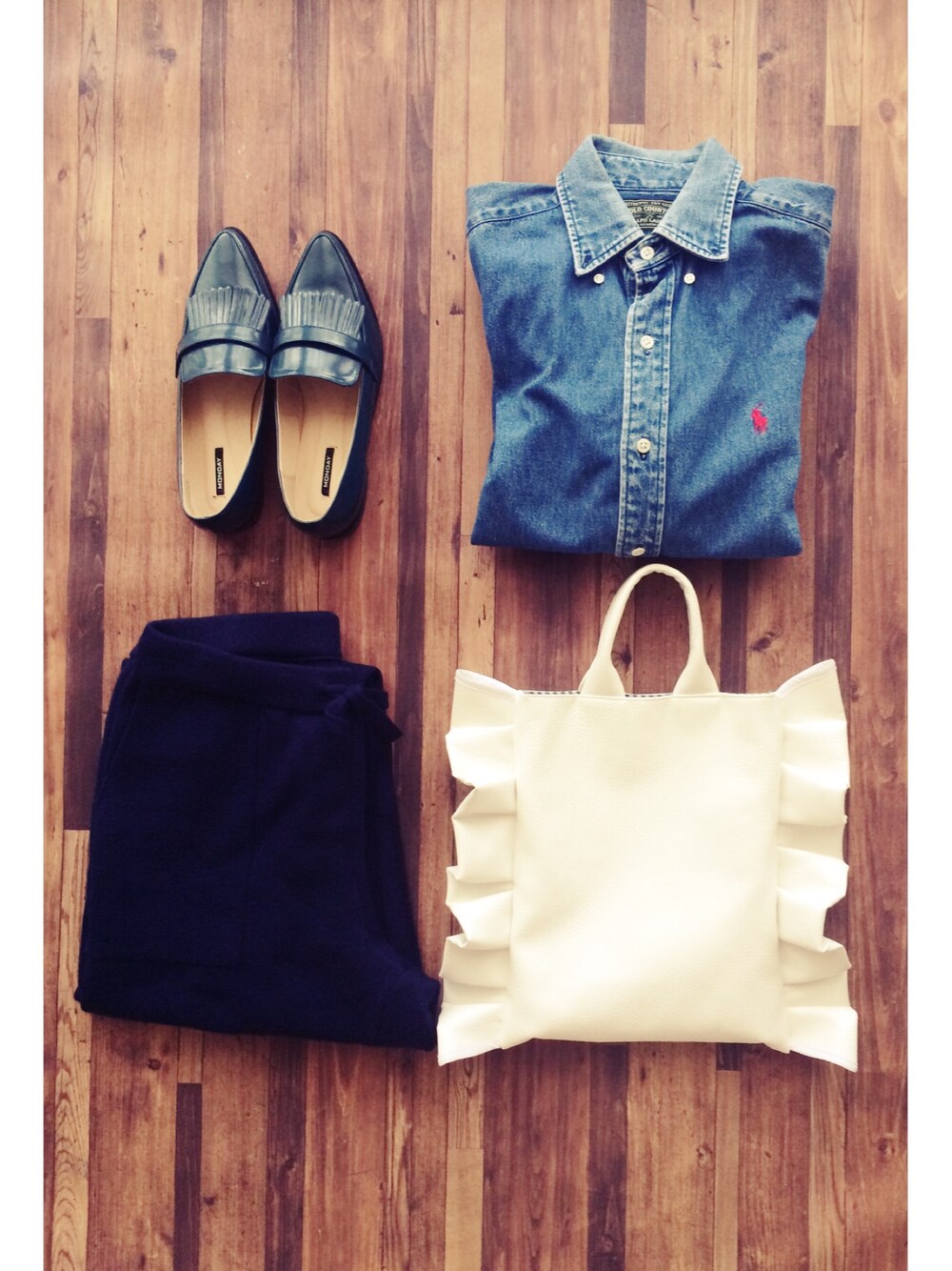 先日のコーデ カジュアルコーデにフリルバッグを持つのがお気に入り。